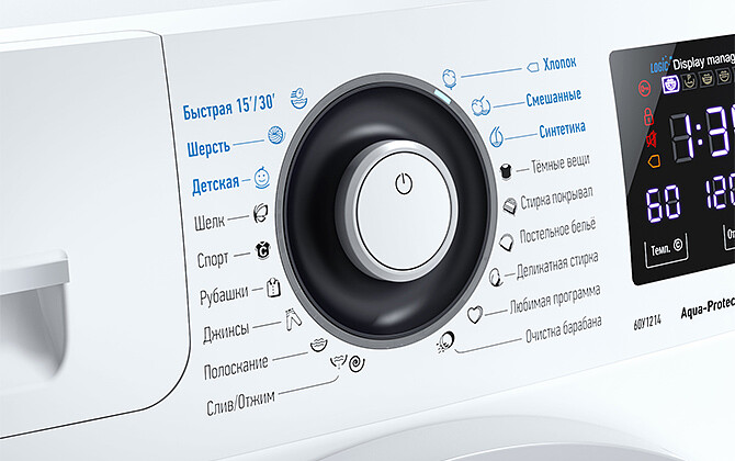 | Программы (режимы) | Хлопок, Смешанные, Синтетика, Темные вещи, Стирка покрывал, Постельное белье, Деликатное белье, Любимая программа, Очистка барабана, Слив/Отжим, Полоскание, Джинсы, Рубашки, Спорт, Шелк, Детская, Шерсть, Быстрая 15'/30' |